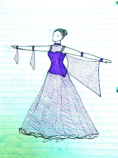 My green pen sadly exploded recently so I couldn't make it actually green, but the purple will have to work as a stand in. The solid purple is satin chiffon, the dotted is georgette, and the striped is organza (with crinoline in the bottom). I debating putting boning in the bodice to give it that nice shape, but the stoning also adds some stiffness so I might not. It has skirts now but my cell phone camera was being fussy and deleted the pictures before I got to transfer them.